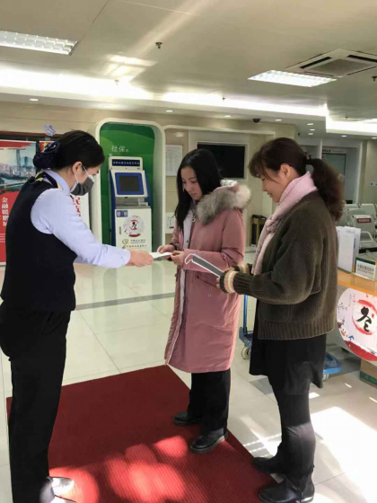 邮储银行福华支行的大堂经理廖丽娜耐心解答客户业务相关问题。此外,还对每一位前来办理业务的客户都进行测量体温和洗手消毒,“一旦遇到温度异常的客户,我们会进行劝导及时就医。”