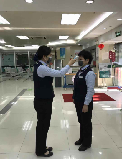 为保证客户服务质量与安全,每日营业前后都对员工进行红外线体温检测,营业人员要通过体温测试正常后上岗,上岗人员均佩戴口罩。