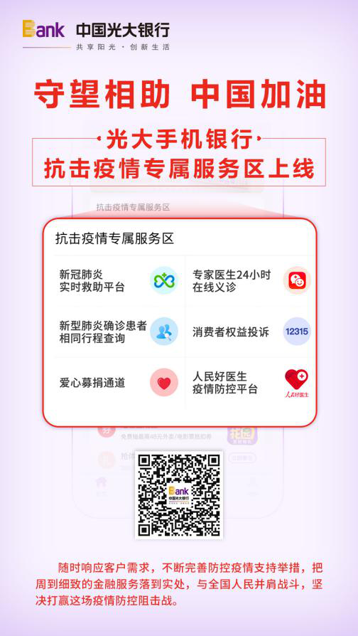 下一步,光大银行将随时响应客户需求,不断完善防控疫情支持举措,把周到细致的金融服务落到实处,与全国人民并肩战斗,坚决打赢这场疫情防控阻击战。(通讯员楼蓉 李昕)