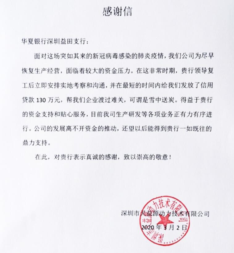 抗疫企业为华夏银行深圳益田支行发来感谢信