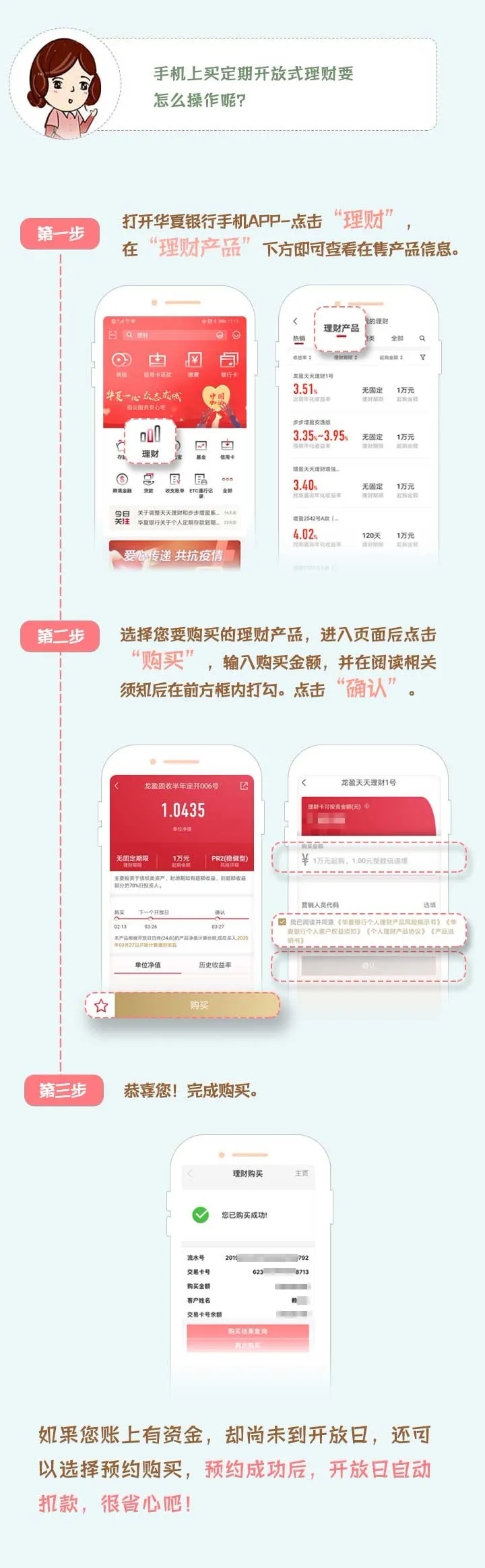 在购买理财产品前,首先要进行风险评估,确认您的风险承受能力,选择与您风险偏好相匹配的理财产品。建议您务必详细阅读每一款理财产品说明书,了解该产品的风险、收益以及到账时间等。