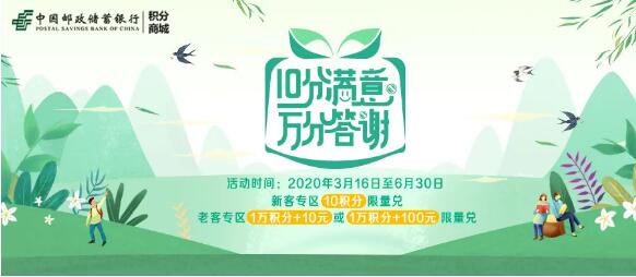 10分满意礼:邮储积分商城新客户可使用信用卡10积分,兑换新客户活动专区商品。
