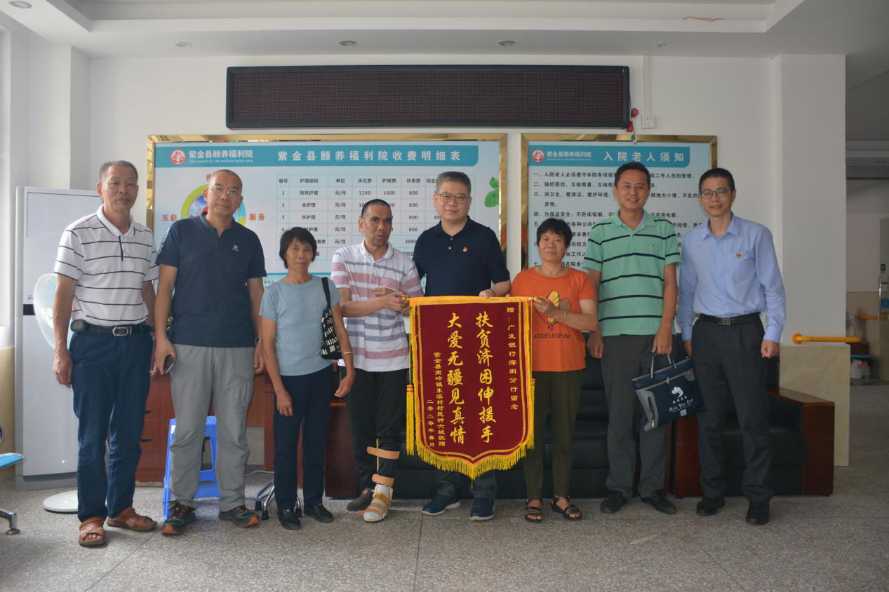 图片为深圳分行党委书记、行长方琦前往紫金县颐养福利院看望贫困户钟某时,他的家人送上锦旗,表达他们一家对深圳分行党委以及分行扶贫工作队的的感激之情