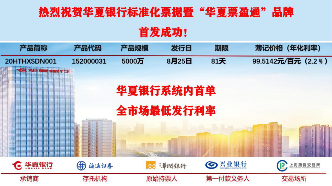 深圳新闻网·见圳客户端2020年8月25日讯 今日,在深圳特区成立40周年来临之际,记者从华夏银行深圳分行获悉,由该行承销的海通证券华夏票盈通2020年度第一期标准化票据产品(产品简称:20HTHXSDN001)在该行系统内率先成功发行。本期标准化票据发行规模5000万,簿记价格99.5142元/百元面值(相当于年化利率2.2%),发行利率创全市场可比同类型、同期限产品新低,将以更低的融资成本支持“稳企业保就业”工作。