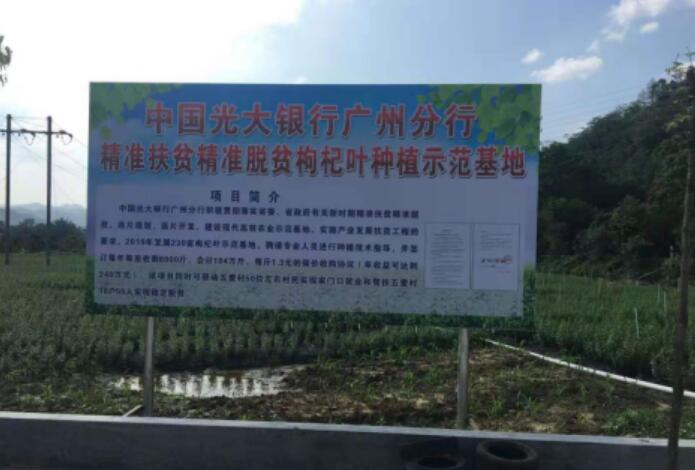 其中,广州分行投入14万元支持广东省阳山县五爱村发展250亩枸杞叶种植产业,该项目在第二年起,每年可带来经济效益约200万元,同时可带动五爱村约50位村民实现家门口就业和帮扶五爱村贫困户18户55人实现稳定脱贫。