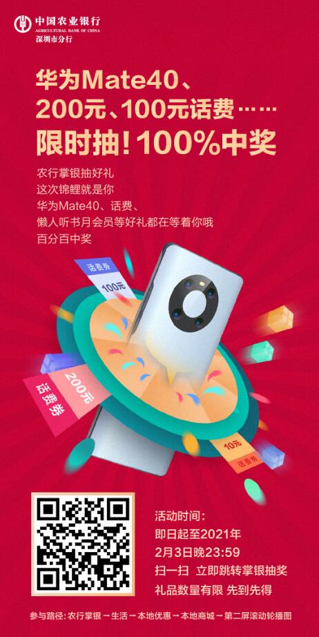深圳新闻网·见圳客户端2021年1月2日讯 农历新年越来越近,农行掌银让您足不出户,动动手指抽好礼,这次锦鲤就是你!华为Mate40、200元话费、100元话费等好礼,限时抽。