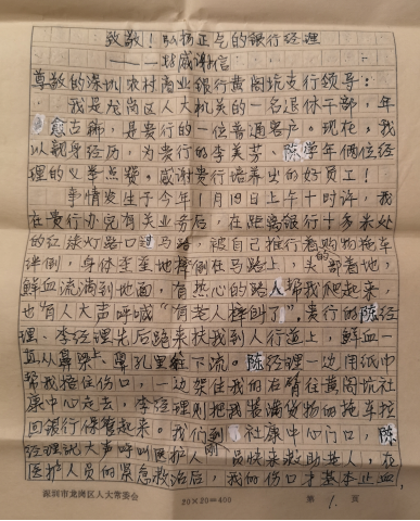 “事发第二天,该行行长又派陈学年、李美芳两位员工到我家探望、慰问,让我全家非常感动。”1月29日下午,伤口刚刚拆线的老人就带着手写的感谢信来到深圳农商行黄阁坑支行,向帮助过他的两位热心人表达感谢之情。感谢信整整三页纸,字迹工整,老人家的诚挚感谢之意跃然纸上。