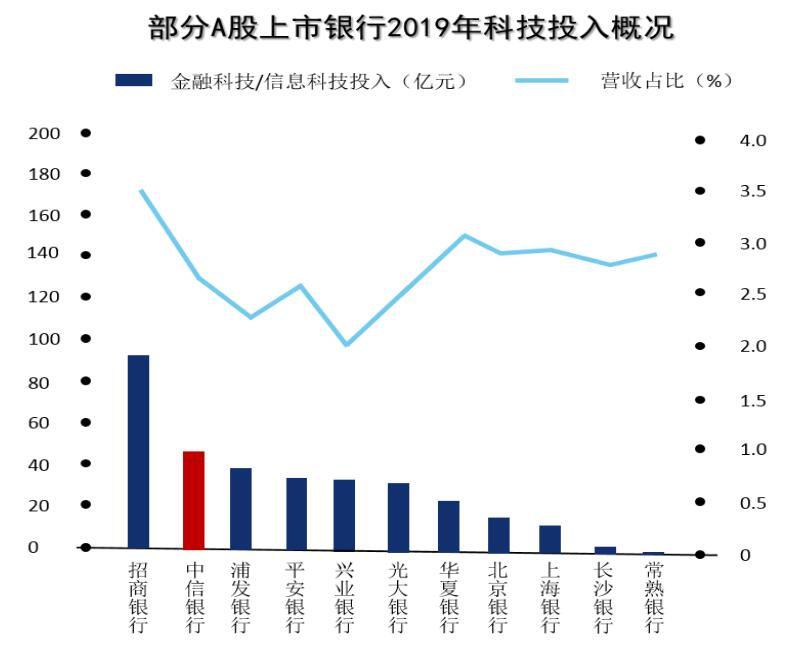 出国金融、青少年、女性、老年不同的细分客群,会有不同的“金融+非金融”服务方式……中信银行一直有感知不同人群温度的传统,但是要上规模积累出核心优势,离不开科技。今年,中信银行确定了“以数字化转型为主线,推动零售经营管理体系迭代升级”的发展策略。2020年中信银行科技投入69.26亿元,位居股份制银行第二,依旧在排名上咬着招商。