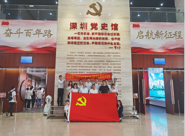 “活动式”教学,增强学习感染力。江苏银行深圳分行充分利用深圳红色教育资源,组织党员实地瞻仰参观遗址、纪念场馆等,增强学习教育的感染力。同时,组织各党支部全年与共建单位党组织策划开展共学党史、共办实事活动,加强互联互动,提升江苏银行品牌影响力。
