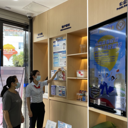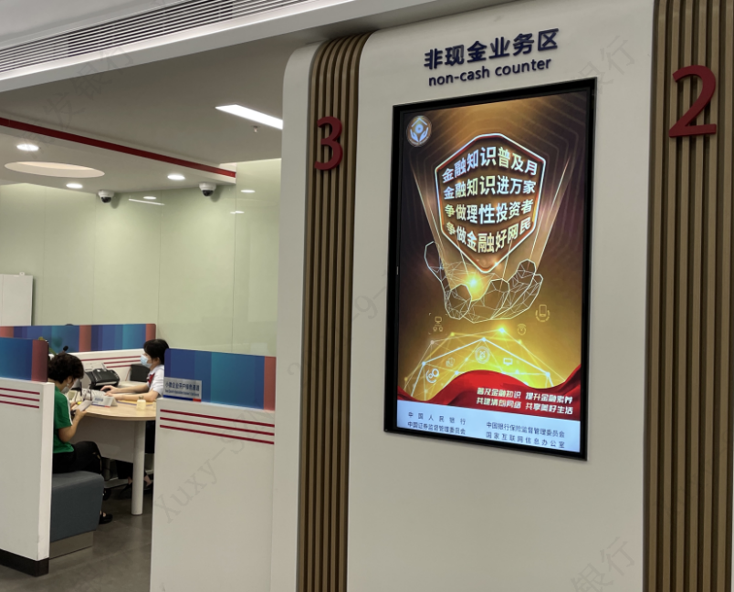 在网点营业大厅内,电子屏中的2021年金融知识普及月海报营造了良好宣传氛围。金融之手,强而有力,各营业网点一手承接了金融知识普及多方面的内容,共同构建了线上线下、电信、网络等多渠道传播的金融知识普及传播网,有力推进,势在必行。