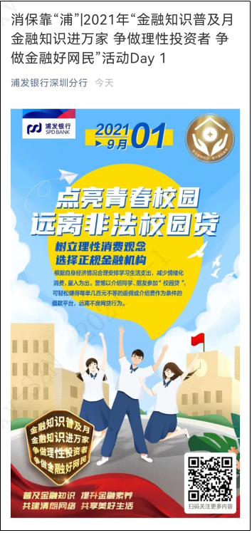 9月1日,也是校园开学的日子。开学的第一天,浦发银行深圳分行特别推出“点亮青春校园远离非法校园贷”日历宣传海报,并在官方微信公众号进行转发宣传,同时在46家网点营业大厅显示屏播放,重点传播校园贷金融知识,提醒学生人群,合理消费,远离不良网贷行为。据悉,该行将在九月每个工作日持续发布消保宣传日历,常态化长效推进金融知识普及月宣传活动的开展。