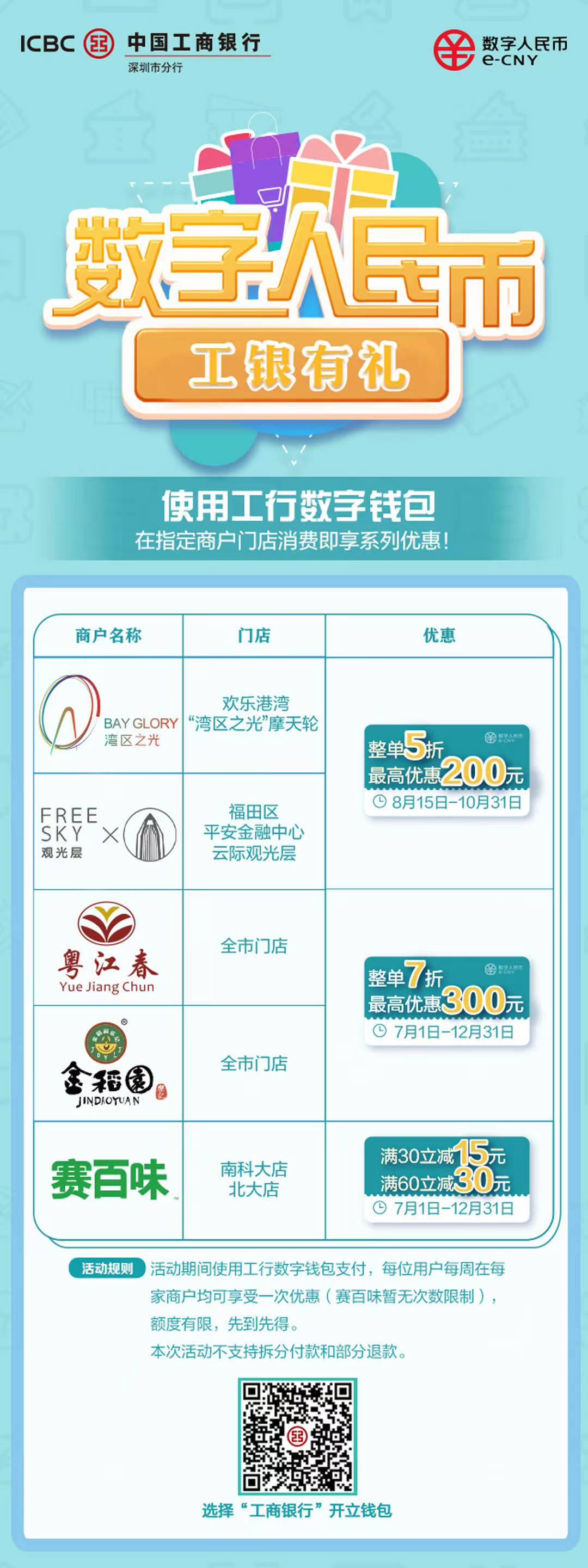今年以来,工商银行围绕“衣食住行游医”开展了系列数字人民币优惠活动,涵盖餐饮、文旅、商超、加油等多个领域,创新数字人民币场景合作模式,加快特色系统的研发投产,做深做强数字人民币在民生领域的试点应用。未来工商银行将继续做好数字人民币多维度应用场景拓展,打造多元化数字人民币结算支付模式,为广大市民带来更多全新的支付体验,助力深圳市数字经济发展再上新台阶。