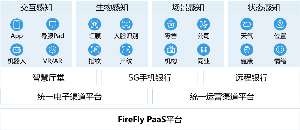 经过多年的持续深耕迭代,民生银行已形成覆盖交互感知、生物感知、场景感知、状态感知的全方位感知技术,并通过统一电子渠道、统一运营渠道、 FireFly PaaS三大基础技术平台,集中发力渠道能力建设及整合,着力打造有温度的银行。
