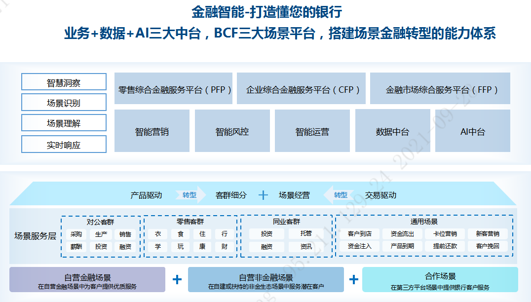 金融智能,是场景金融的驱动器。民生银行全面转向场景化客群经营的业务模式,围绕客群精细化经营,应用“业务中台+数据中台+AI中台”能力,智能匹配客户需求,提供场景化的综合金融服务。
