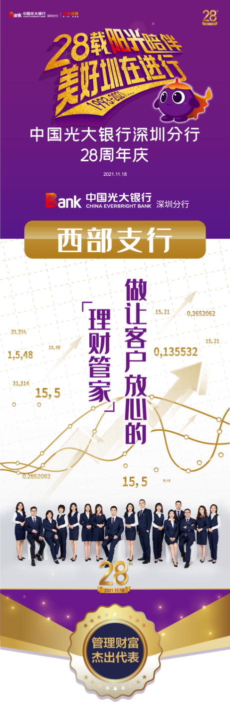 作为财富管理业务的先行者,光大银行一直致力追求做让客户放心的“理财管家”。西部支行始终坚定朝着总分行打造“一流财富管理银行”的战略目标方向赶超奔跑,建设专业的财富管理团队,管理财富,服务民生。在光大银行深圳分行28周年的“十大最美光阴故事”管理财富类评选中,西部支行脱颖而出,获评管理财富杰出代表。