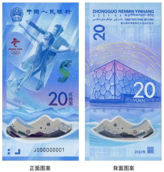 正面图案:正面主景为花样滑冰运动员图案,上方为中华人民共和国国徽、“中国人民银行”行名,左侧为第24届冬季奥林匹克运动会会徽,右侧为光彩光变乐谱图案、面额数字“20”与汉字“贰拾圆”,下方为动感全息图案、透明视窗、盲文面额标记和冠字号码。