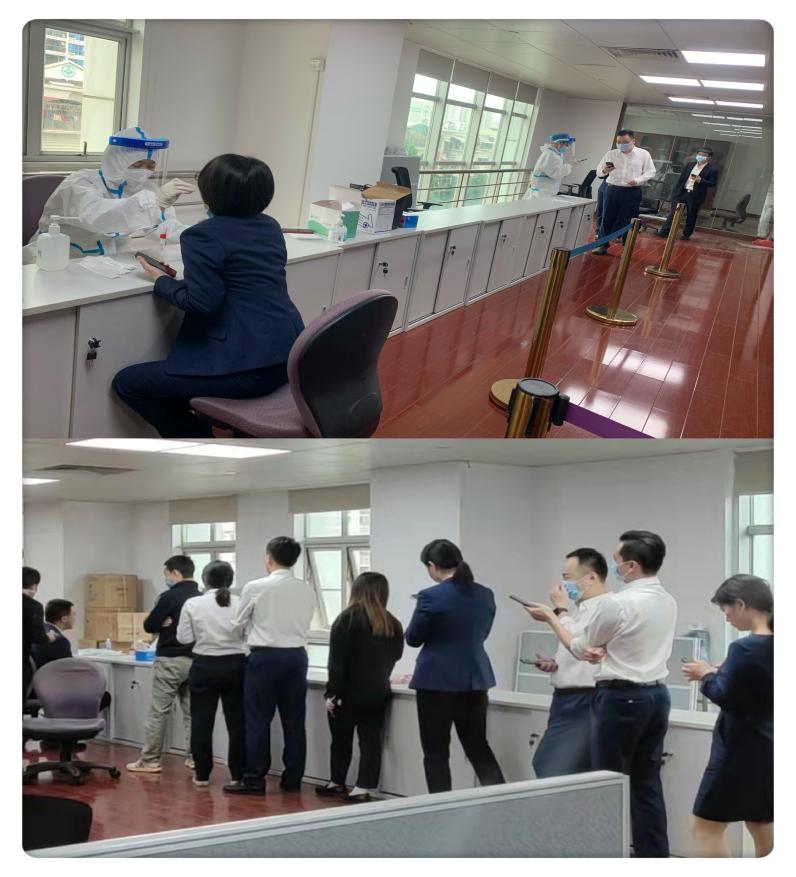 为确保疫情防控工作有力、有序、有效,深圳分行及时完善防疫专员机制、紧急处置疑似疫情流程机制、防疫物资保障机制,做到责任到人。结合实际,深圳分行还提出了严守防疫纪律的要求,党员领导干部带头执行出行管理、场所管理、请示报告等方面的规定。员工是企业最大的财富,为切实保障员工生命健康,考虑到员工自行进行核酸检测预约、排队耗时较长,迅速行动,经多方协调,深圳分行联系核酸检测机构在分行驻点为员工进行集中检测。与此同时,深圳分行为各经营单位配置足量防疫物资,尤其是消毒用品,能够满足第一时间对经营场所的消杀需求。