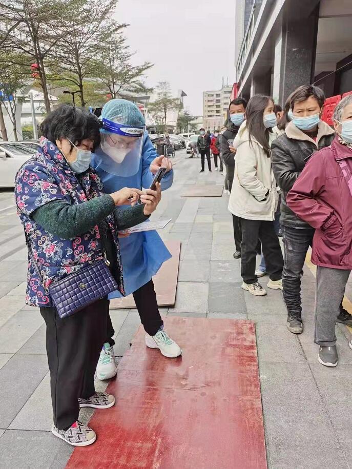 2月17日,景华社区公园核酸筛查检测点。面对大量参与核酸检测的市民,青年志愿者耐心做好指引解释,指导群众扫码、采集信息,教居民操作检测小程序,开展防疫宣传,维护现场秩序,保障核酸检测工作井然有序进行。因核酸检测点在居民区,老年人较多,对核酸检测登记小程序操作流程不熟悉,再加上是夜晚检测,现场光线不足,给服务工作带来一些难题,但青年志愿者们没有退缩,而是拿出在工作中服务客户的劲头,更细致、更耐心解决问题,做好志愿服务。