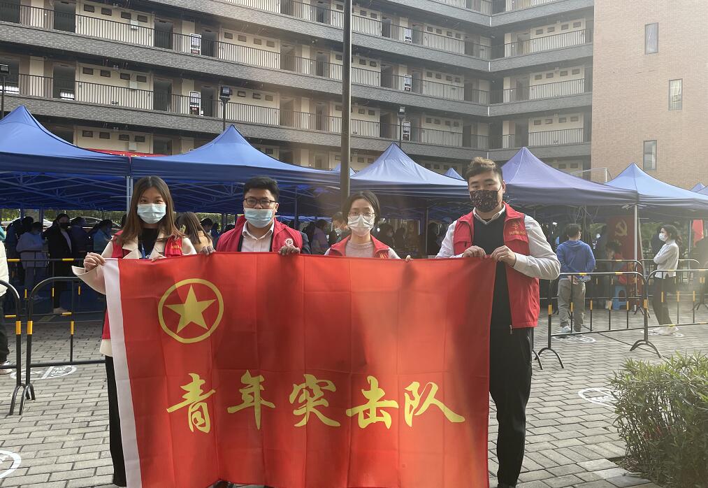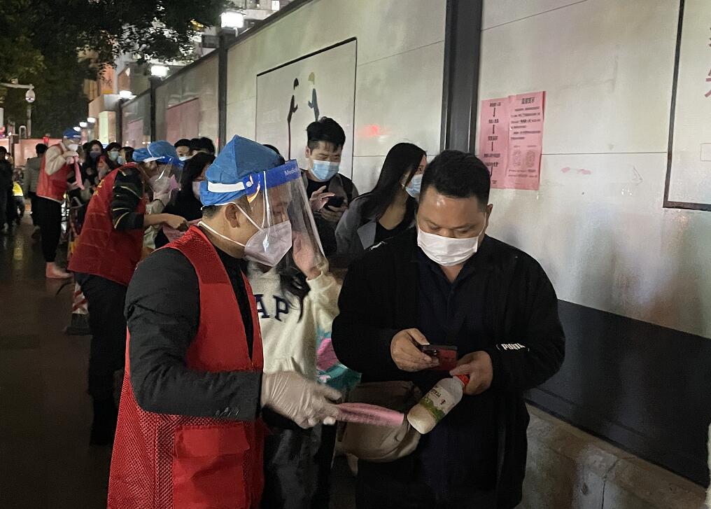 2月18日,青年志愿者们顾不上吃晚饭,一下班就奔赴南园社区核酸筛查检测点,与南园社区的志愿者们一起投入到维护核酸采集秩序的队伍中,一直服务到深夜。