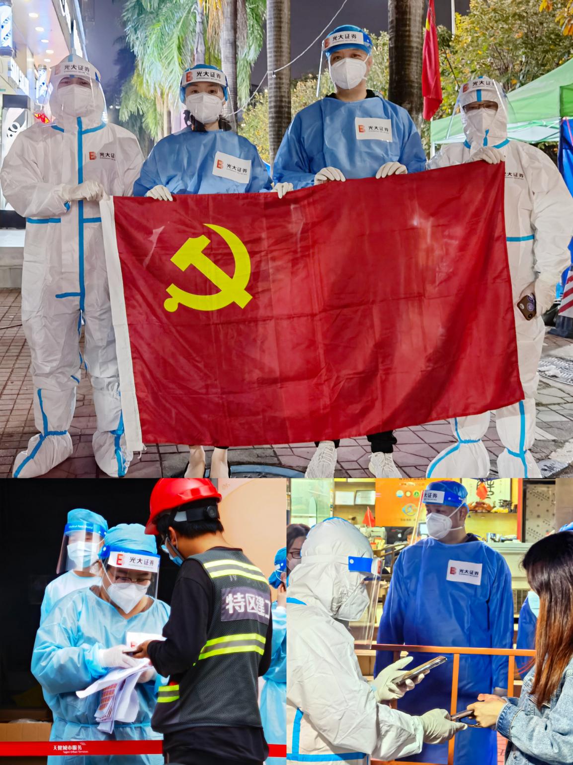 光大证券深圳分公司发挥基层党组织战斗堡垒作用和党员先锋模范作用,党员干部迅速牵头组建了“光证深分先锋队”,下沉基层抗疫一线,党员同志们换上防护服、手套和隔离面罩深入莲花街道多个社区,全力协助医护人员做好核酸检测的辅助工作。从白天到黑夜的坚守,顶着温差很大的深夜寒风,保持良好状态,为广大群众的身体健康安全提供了有力保障。一句句暖心的提示、一个个忙碌的身影,光大证券深圳分公司的志愿者们,用实际行动,坚定地守护着鹏城的人们!