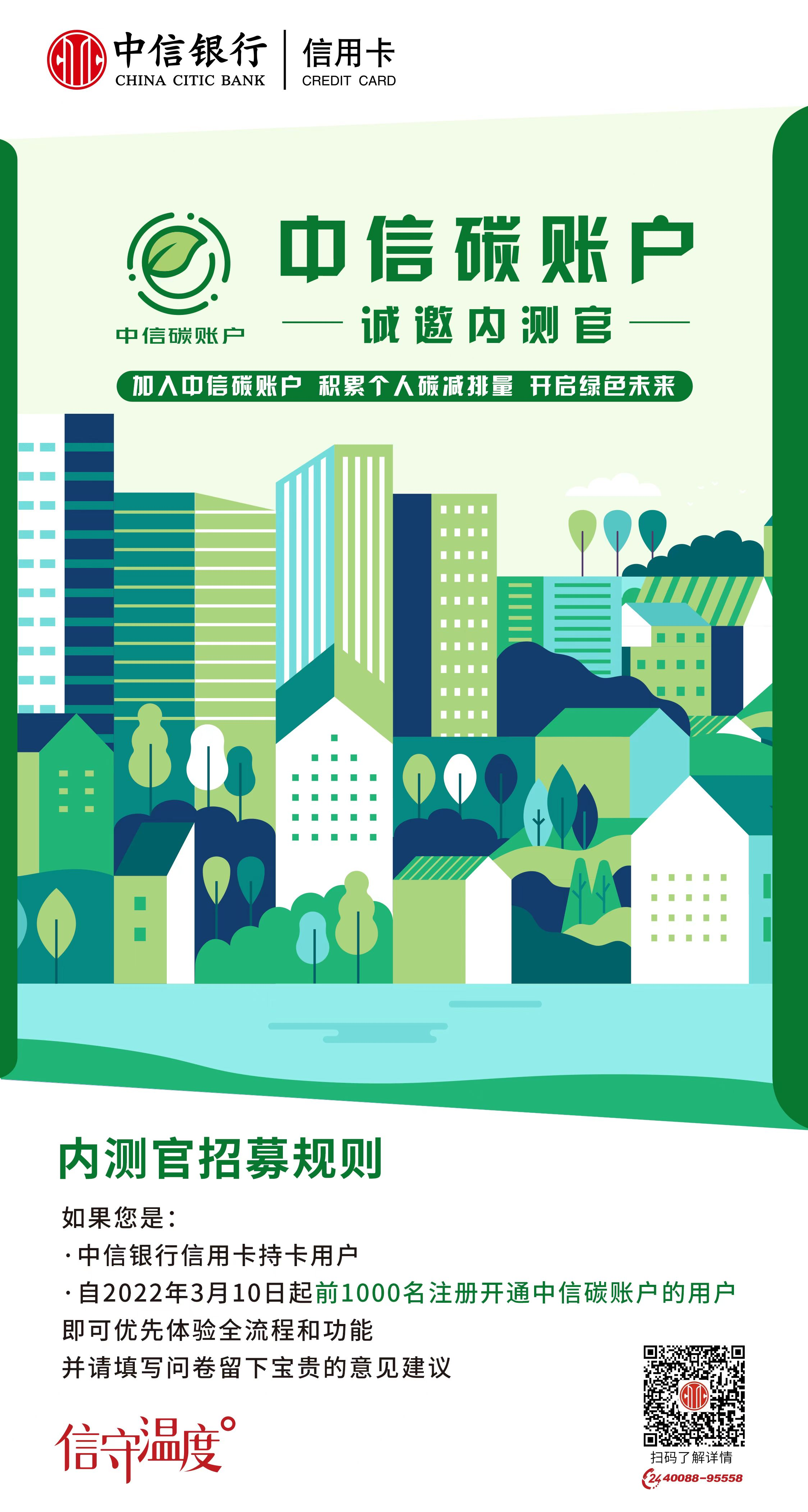时值中国植树节前夕,“中信碳账户”内测版现已上线,于3月10日起公开招募1000名用户参与内测版体验,首批体验官登录中信银行信用卡“动卡空间”APP,即可在线开通个人碳账户,获取关联个人低碳行为的碳减排量,并可对碳账户的内测版功能提供优化建议。据中信银行相关负责人介绍,目前,内测版已经上线生活缴费网上办理(含水费、电费、燃气费等)、申请电子信用卡、开通电子账单等低碳行为的碳减排量核算。即将上线的公开版还将包含绿色出行、二手回收等更丰富的绿色低碳生活场景。