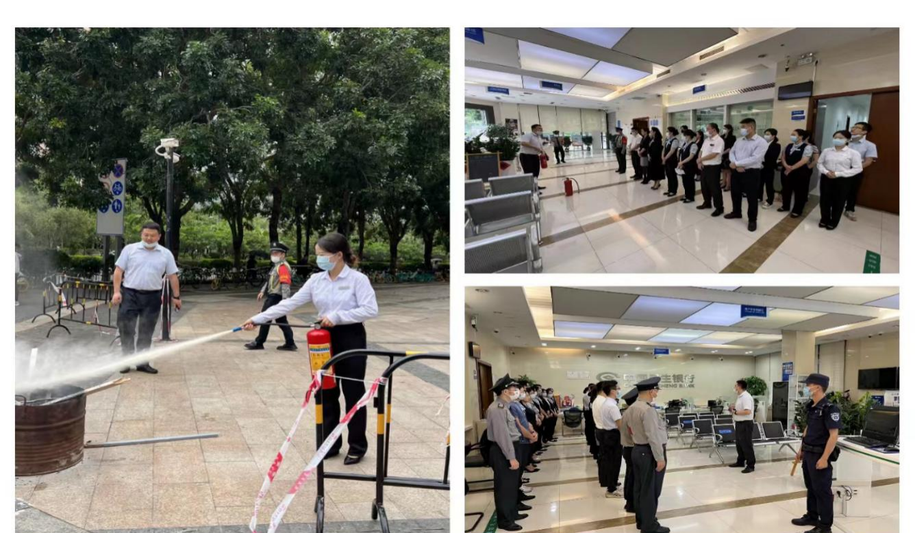 本次演练分为营业厅发生客户过激事件处理、歹徒持枪抢劫、消防知识培训及疏散演练三部分。演练过程中,支行大堂经理及现金柜员面对险情,临危不乱、随机应变。各小组人员密切协调配合、履行岗位职责,快速反应、及时报警,安保队员及监控室队员认真观察歹徒的样貌和逃跑路线及举动。随后的消防演练中,分行保卫部人员对灭火器的使用方法进行了系统讲解,并指导支行全员进行实战操作。