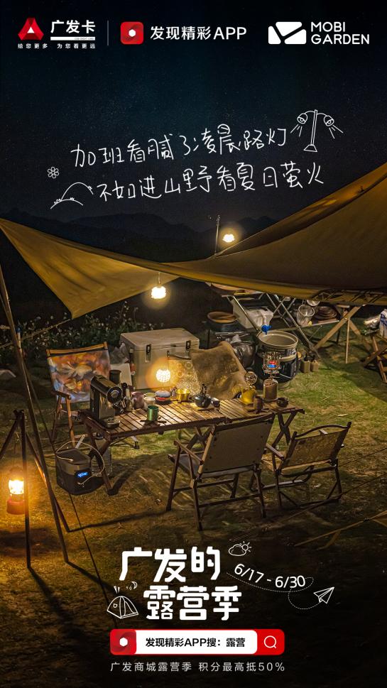读特客户端•深圳新闻网2022年7月6日讯(记者 朱琳)一顶帐篷、一片草地、一桌餐品,呼吸户外新鲜空气放松身心……露营逐渐成为年轻人的户外休闲方式。对此,广发信用卡继推出国内首个沉浸式夜宿露营发布会之后,近日又以露营主题切入新世代年轻人的需求点,布局户外露营场景,上线为期两月的“广发的露营季”主题活动,在提倡城市生活“慢下来,去感受”理念的同时,也释放了一大波户外露营标配商品的折扣福利干货。