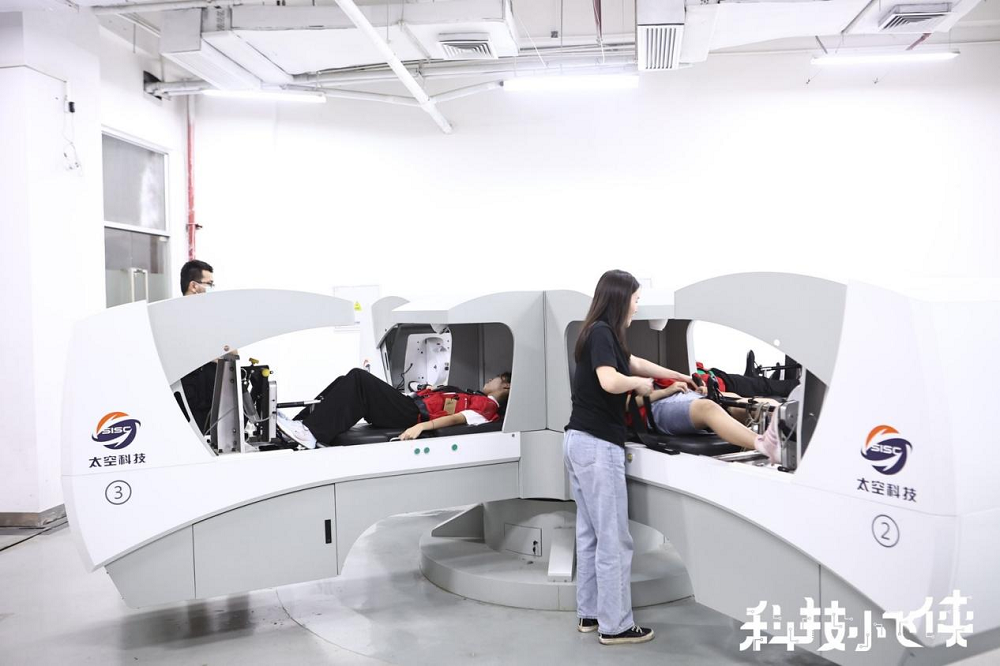 除了太空废弃物处理实验,航天训练体验也得到了孩子们的认可。活动现场,短臂离心机、模拟失重床等设备模拟出了航天员的日常训练场景,还没等讲解老师解说完,就有不少小飞侠们欢呼雀跃,迫不及待地想体验航天员日常训练,旋转、漂浮,小朋友们玩得不亦乐乎,在玩乐的同时,也学习到了更多航天知识。