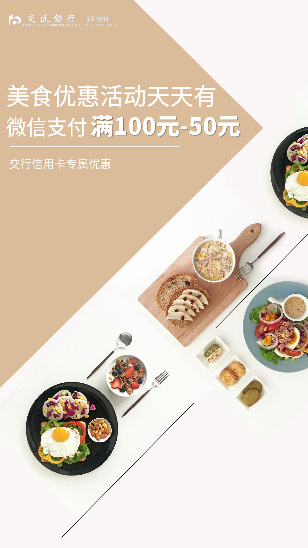 活动内容:交通银行深圳地区持卡客户(借记卡或信用卡),在指定餐饮品牌门店线下消费,使用微信支付(绑定交行卡),有机会享受满100元减50元优惠(最高减50元),每人每月最高享两次机会,名额有限,先到先得。