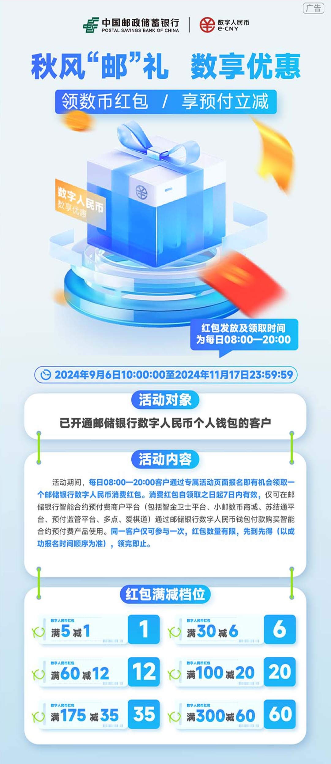 2024年9月6日10:00至2024年11月17日23:59,已开通邮储银行数字人民币钱包的客户,活动期间,每日08:00-20:00客户通过专属活动页面报名即有机会领取一个邮储银行数字人民币消费红包。消费红包自领取之日起7日内有效,仅可在邮储银行智能合约预付费商户平台(包括智金卫士平台、小邮数币商城、苏结通平台、预付监管平台、多点、爱棋道)通过邮储银行数字人民币钱包付款购买智能合约预付费产品使用。同一客户仅可参与一次,红包数量有限,先到先得(以成功报名时间顺序为准)领完即止。