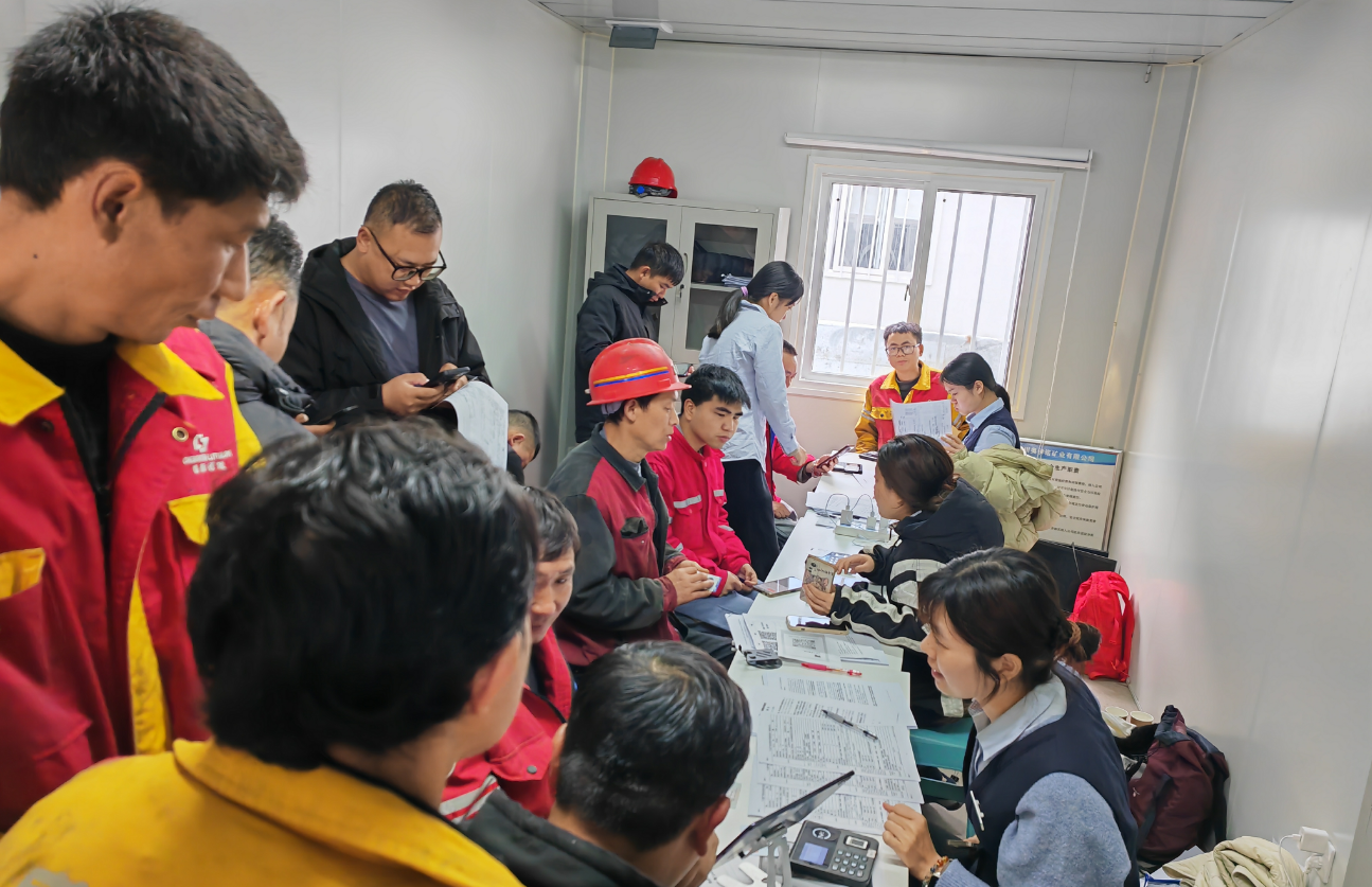 面对困难,陈嘉涛深知客户需求无小事。他果断决定带队前往现场,为当地员工集中办理银行卡开卡及工资代发相关手续。从繁华的深圳到偏远的高原,路途遥远、舟车劳顿,加上高原反应带来的身体不适,让整个团队面临严峻考验。但他们没有丝毫退缩,抵达后便迅速搭建临时服务点,投入到紧张的工作中。