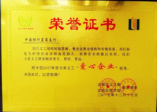 近日,深圳市龙岗区义工联、龙岗图书馆书香义工2017年度总结大会在龙岗区文体中心召开。大会授予中国银行深圳皇岗支行书香义工“爱心企业”称号,并联合颁发荣誉证书。