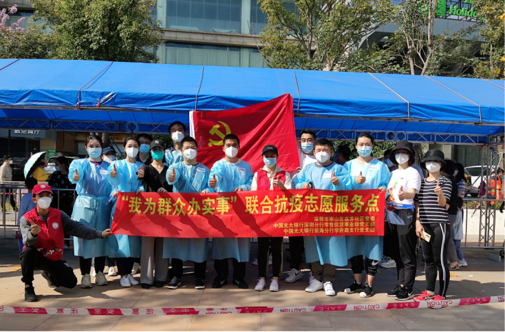 近期,深圳疫情防控再度升级。积极响应政府号召,光大银行深圳分行充分发挥基层党组织战斗堡垒作用和党员干部先锋模范作用,组建“我为群众办实事”联合抗疫志愿服务队,积极履行央企责任担当,与全社会共筑疫情防控坚固防线。