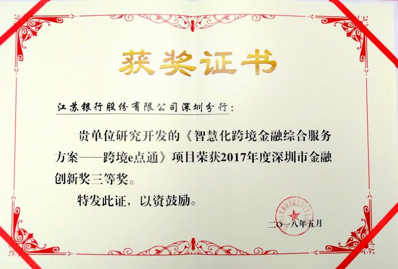 日前,深圳市政府2017年度金融创新奖评选结果揭晓,江苏银行深圳分行“智慧化跨境金融综合服务方案—跨境e点通”项目斩获三等奖,这是该行连续四年获得金融创新奖后再次获此殊荣,该行也由此成为深圳地区唯一一家五次荣获金融创新奖的城商行。