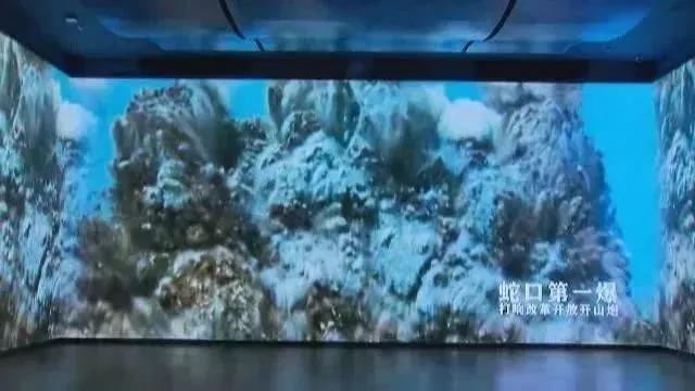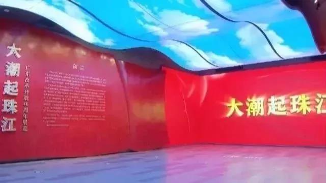 序厅三折屏LED影像墙。屏幕以超大视窗、多维角度、声光电整体联动,播放“大潮起珠江”主题片,气势磅礴、引人入胜。