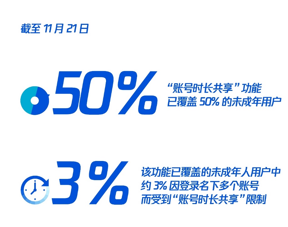11月15日在《王者荣耀》启用的“账号时长共享”功能,基于自然人身份对未成年用户名下账号的总游戏时长进行合并计算,目前正在逐步发挥效力。