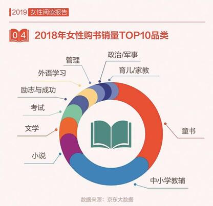 京东大数据显示,女性的读书量显著提升,2018年,女性读者人均购书7.6本,高于男性,女性读者在纸质书购买上的人均消费近230元,女性的“阅读力”正在变得越来越强。从图书销量上看,2018年女性读者购买最多的图书是童书、中小学教辅、小说、文学和考试,可见对于大部分女性而言,购书的主要目的是出于育儿的需求。