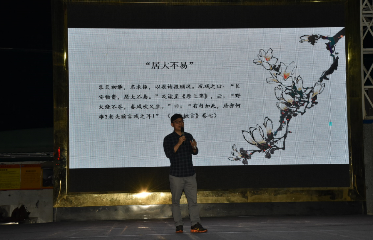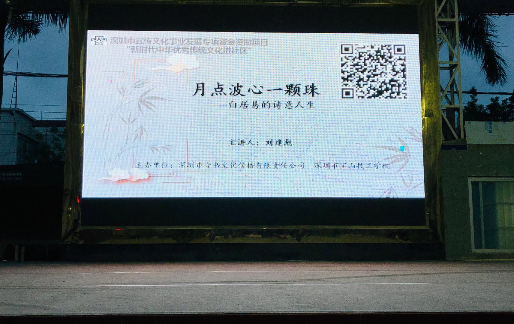 深圳新闻网讯 5月29日晚上,“新时代中华优秀传统文化进社区”系列活动第三场公益文化讲座之“月点波心一颗珠——白居易的诗意人生”在深圳市宝山技工学校宝山大舞台拉开帷幕,由爱诗家创始人刘建彪带领听众一同走进“诗王”的诗意世界,感悟其至情至性。
