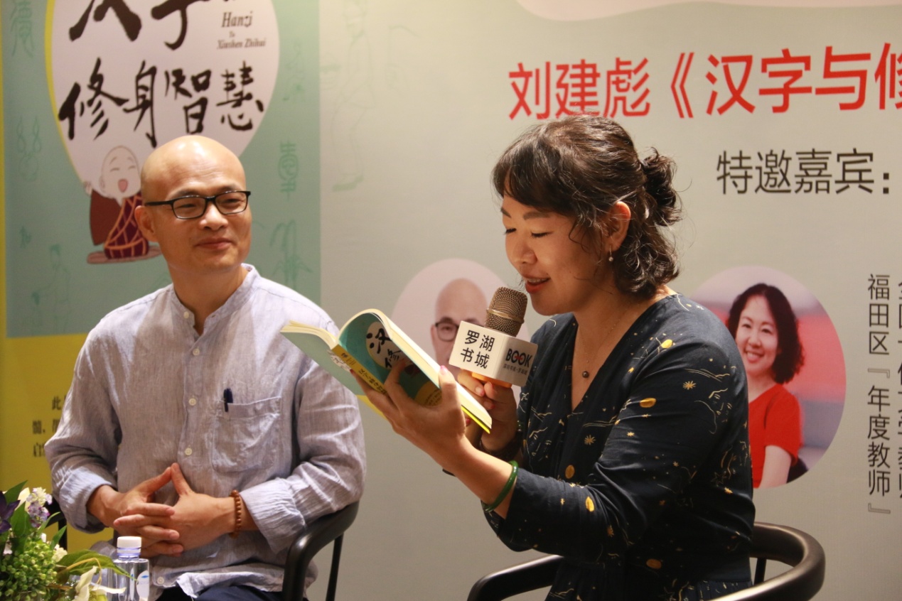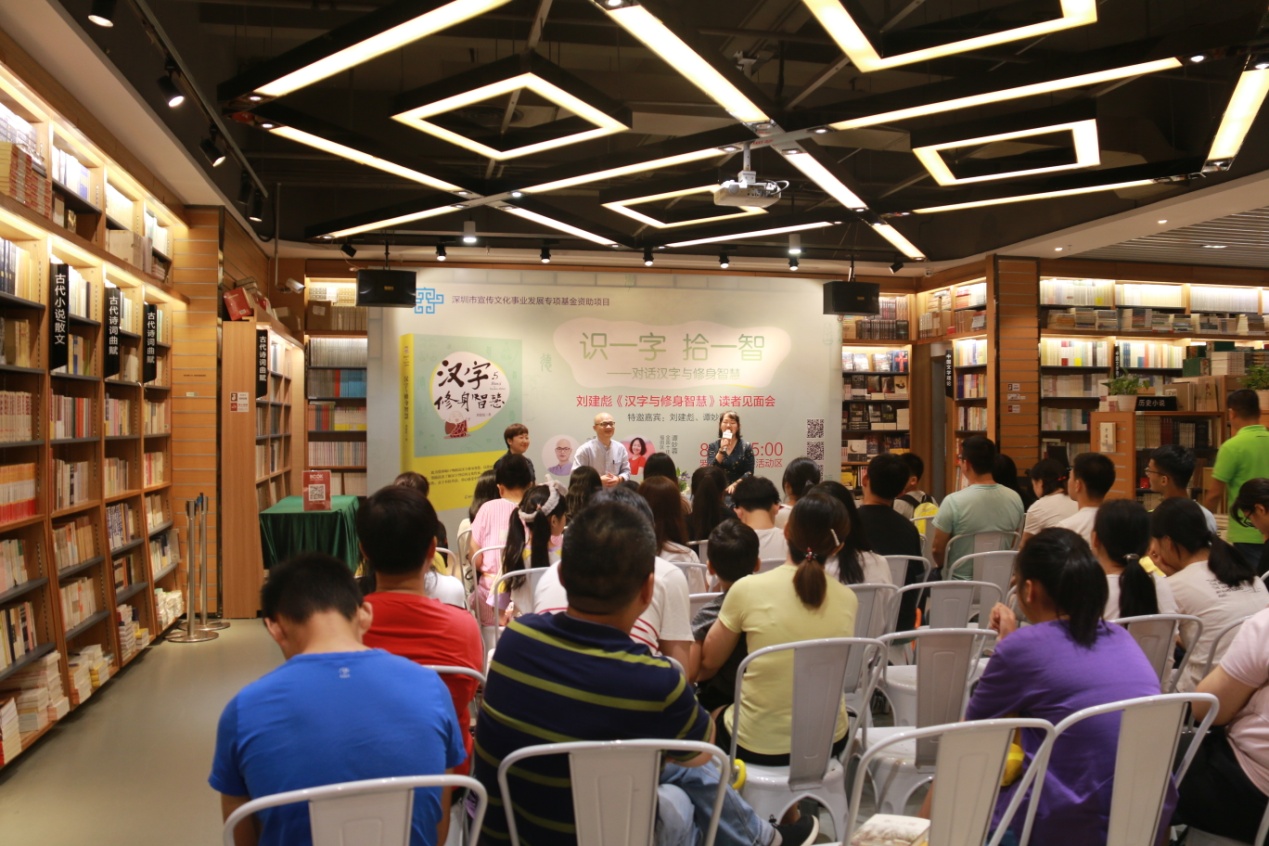 活动由深圳书城罗湖城张华女士主持,邀请到壹读书会创始人、知名阅读推广人、 《汉字与修身智慧》作者刘建彪先生和全国十佳文学教师、广东省阅读推广“点灯人”谭妙蓉女士担任对话嘉宾,为听众讲述汉字的起源以及他们根据切身体会对汉字的解读。
