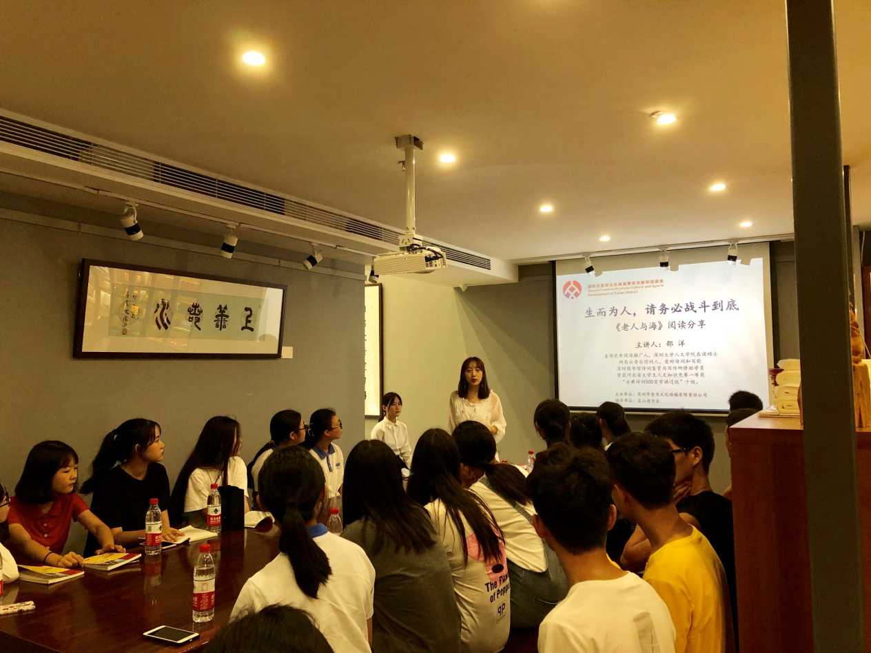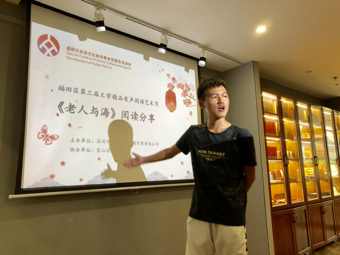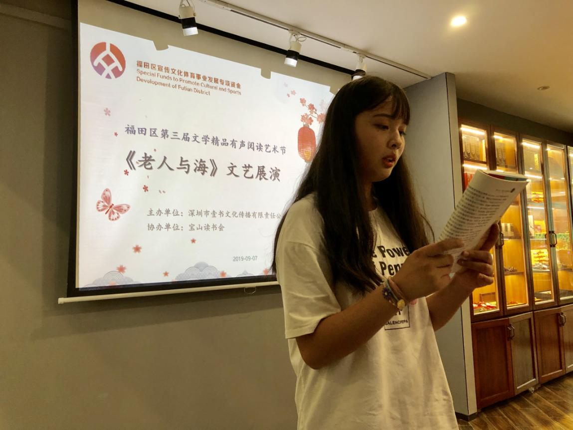 深圳新闻网讯 2019年9月7日,由深圳市壹书文化传播有限责任公司主办、宝山读书会协办的“福田区第三届文学精品有声阅读艺术节”之《老人与海》阅读分享会暨文学作品朗诵会在简阅书吧香蜜湖店成功举办。来自深圳市宝山技工学校的学子们在主讲人的启示下分享阅读感悟、诵读精彩文摘,在文艺展演中体会圣地亚哥抗击命运的人生哲学。
