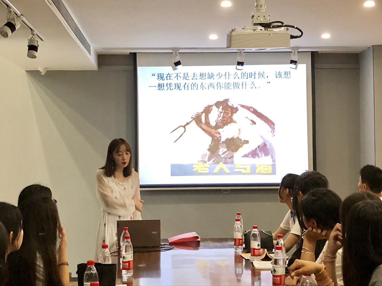 《老人与海》通过讲述一个老渔夫的故事,揭示了人类共同的命运,给读者带来关于勇气、不屈不挠、与命运作斗争的精神启迪。围绕“生而为人,请务必战斗到底”这一主题,邵洋提出了“是选择放弃,还是一往直前?”这一问题,引起在座同学的思考。随后,她又通过解读《老人与海》中的喻象与艺术、生命与理想,为同学们总结值得学习的写作思路。