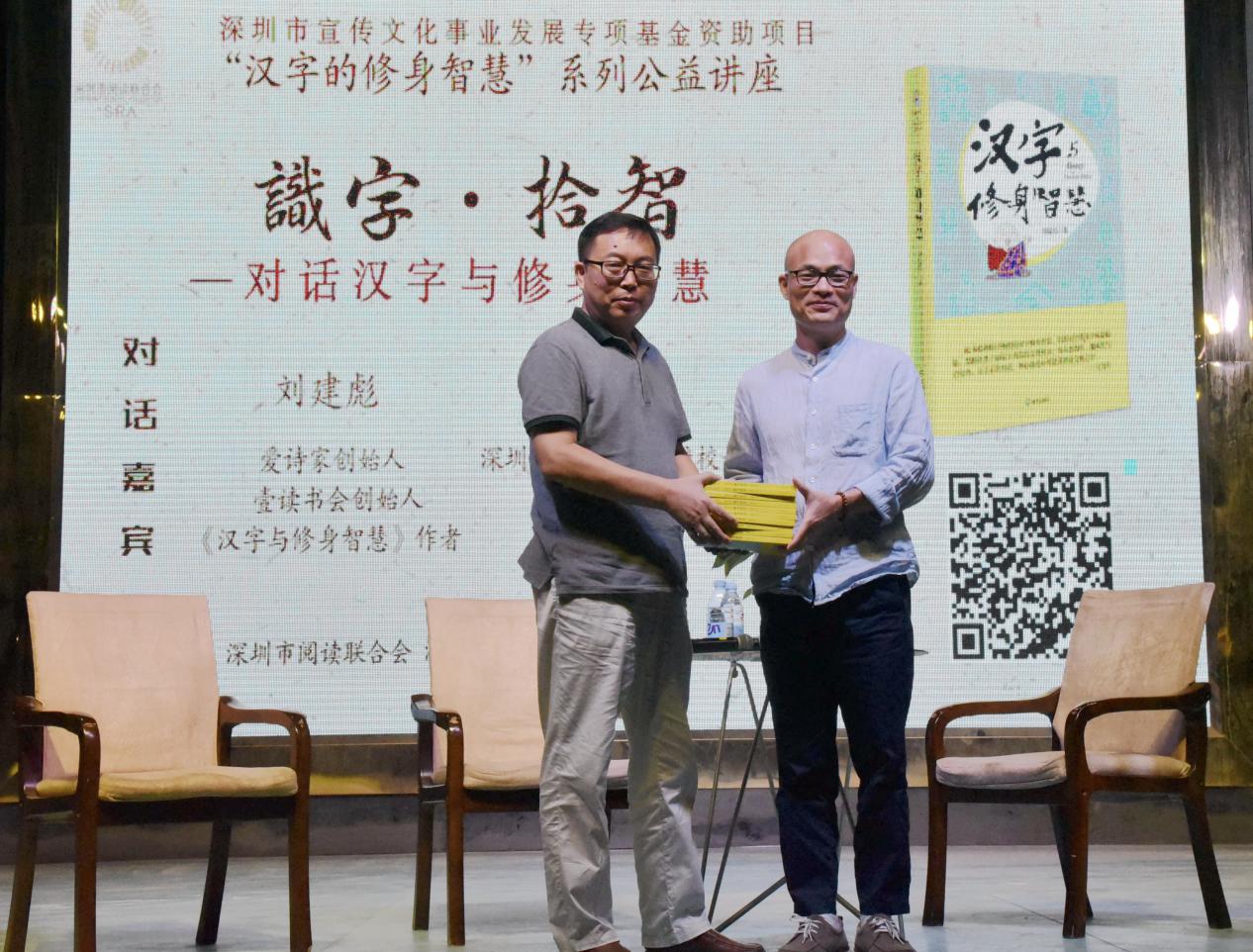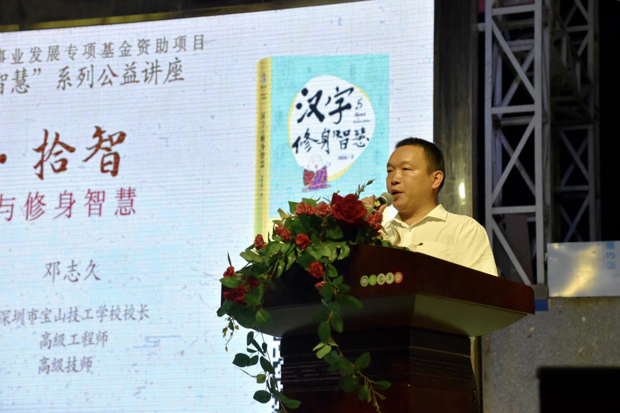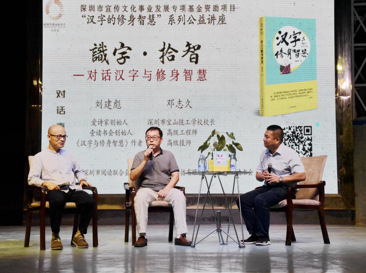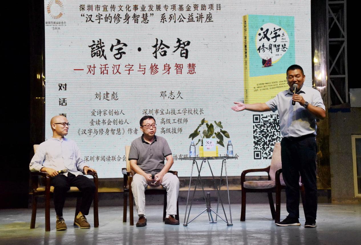 深圳新闻网讯 9月18日晚上7时,由深圳市阅读联合会、深圳市壹书文化传播有限责任公司和宝山读书会共同主办的“‘识字拾智’——对话汉字与修身智慧”公益文化讲座在宝山技工学校宝山大舞台拉开了序幕。据悉,这是由深圳市宣传文化事业发展专项基金资助项目“汉字的修身智慧”的第三场公益文化讲座,以刘建彪《汉字与修身智慧》新书分享为契机,传播汉字正能量,让更多的青少年识字长智,领略汉字文化之精妙。