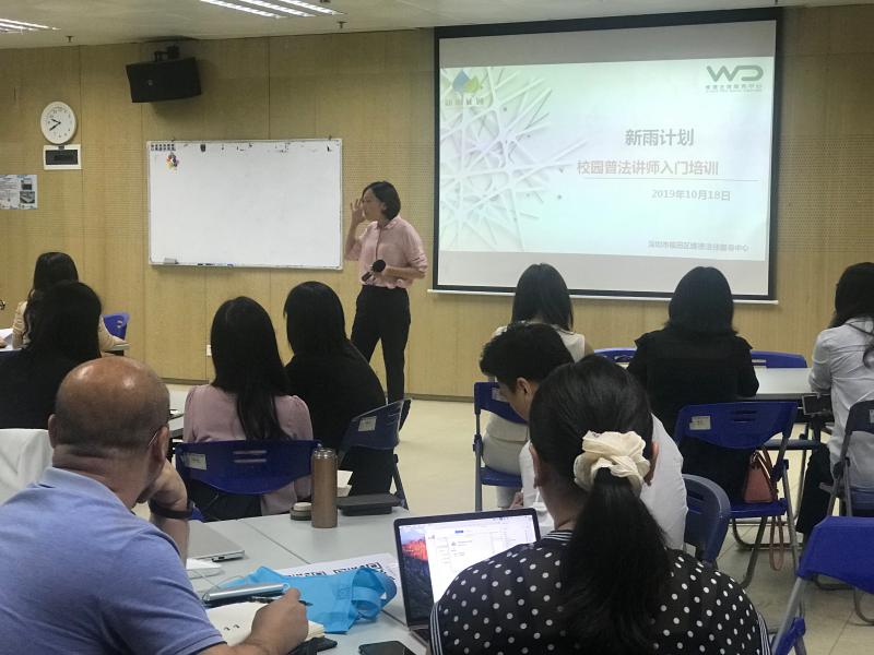 据介绍,在2019年秋季学期,新雨计划项目共收到福田区20个学校,181个班,362节课的普法课程授课需求,自10月14日开始,新雨计划项目志愿律师已经陆续开始进入校园授课。为满足更多学校的普法课程需求,同时也为更多志愿律师提供参与到新雨计划项目活动中的机会,维德中心于10月18日、19日分别举办了一场志愿律师岗前培训活动,参与过培训的律师后续需要提交一份试课视频供新雨计划资深授课律师进行评估,试课视频经评估合格的志愿律师将能够认领班级参与校园授课活动。