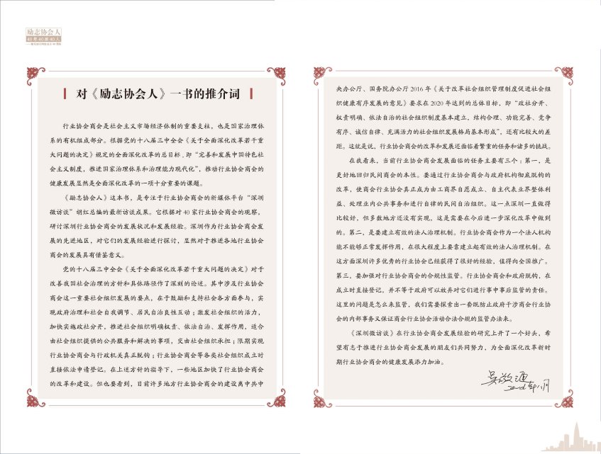 浙江大学公共管理学院院长郁建兴教授肯定深圳微访谈编著的《励志协会人》,从探索行业协会商会的实践角度切入,对行业协会商会及运营人的实践经验和品牌进行总结分析和传播,这对于行业协会商会实现提升治理能力的目标,具有重要意义。