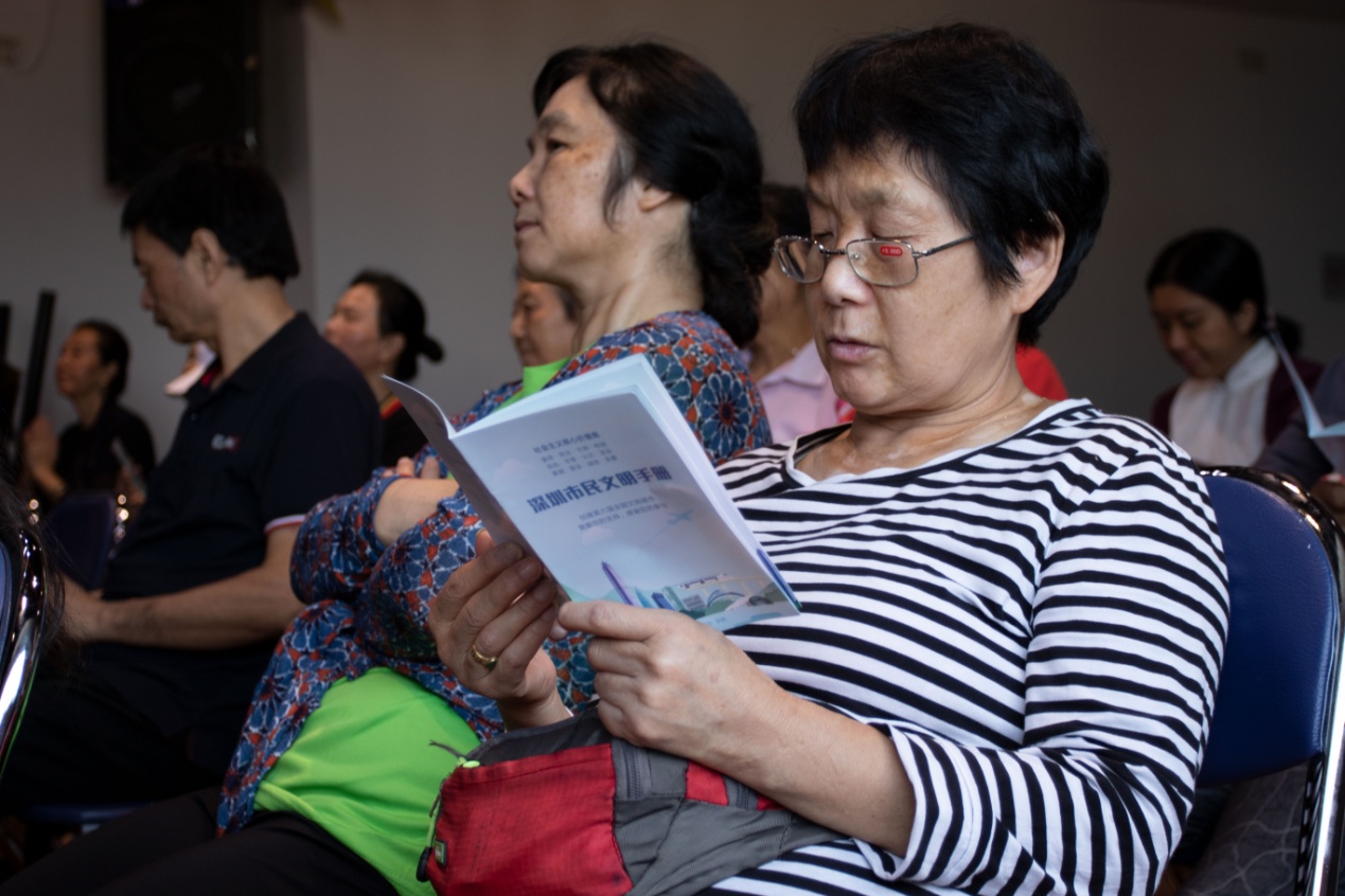 11月13日上午,本系列活动的第六场讲座在龙联社区工作站拉开了序幕。讲座开始前,现场听众每人手上都拿到一本《深圳市民公约》小手册和《汉字与修身智慧》学习资料,刘建彪老师首先跟大家互动:“我们需要什么样的家园?文明城市从哪里开始?”“美丽、温馨、文明、和谐的家园”,台下一位叔叔的声音尤其洪亮,刘老师及时肯定了他的回答。刘老师接着说,文明城市从人开始,人是建设文明城市的中坚力量,他进一步补充道,做文明人的第一步是转变思想,只有了解并认同文明的重要性,才会自觉地践行文明礼仪,积极参与城市文明的创建。