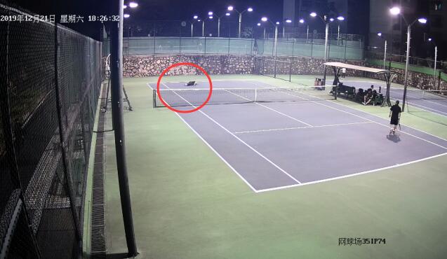 图:正在打网球的李老伯(远处倒地者)突然倒地失去意识。