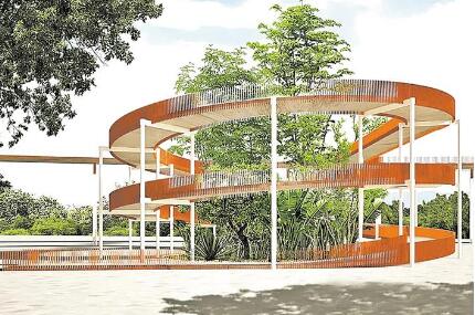 公园总体规划面积402.93公顷,整体规划结构为“一轴三区”。“红桥”作为最具代表性的景观构筑物贯穿整个项目,将运动森林公园与城市和森林相连接,并通过多种创意联系方式衔接各趣味空间。它从公园主入口延伸至碧湖运动区,与大顶岭绿道相接,路径沿线包括螺旋楼梯、隧道、地面段和高架桥等,高架部分长3550米,平均高度8米,柱跨15米,廊桥框架材质以钢结构为主。