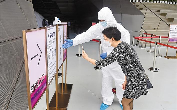 在关山月美术馆门前,参观的市民要先测体温后观展。