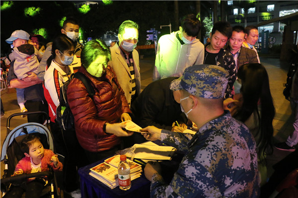 演出中间穿插着跟征兵主题相关的有奖问答环节,普及征兵和国防知识,增强活动趣味性,互动性,现场的群众踊跃参与答题。