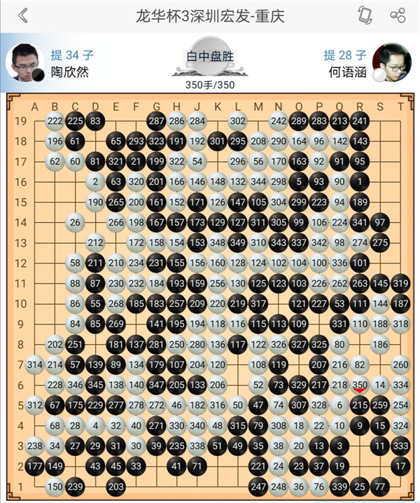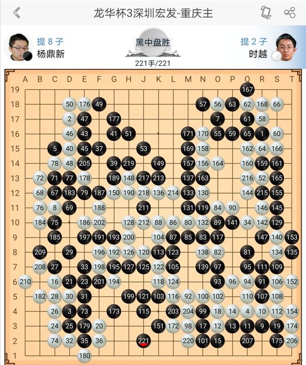 一台戎毅执黑对阵李轩豪,右上战斗后黑棋稍有优势,之后黑棋冲击中央白棋过分,应该慢慢收官,白棋正确应对,战斗中便宜后获得胜利。二台主将时越执白对阵等级分排名第二的杨鼎新,中盘黑棋打入右边后形成乱战,白棋失误比黑棋更多,战斗结束进入官子时黑胜势。
